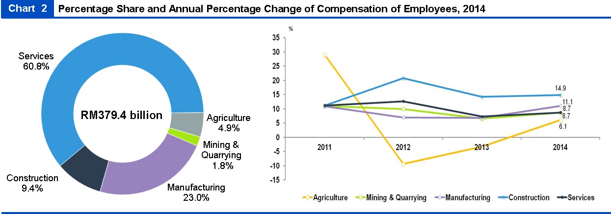 Compensation of Employees grew at a strong rate of 9.7 per cent largely impelled by Services and Manufacturing sectors. Compensation of Employees for Services sector increased to 8.7 per cent (2013: 7.3%) driven by the double-digit growth in Wholesale & Retail Trade, Food & Beverage and Accommodation at 13.9 per cent. Manufacturing sector recorded a significant increase of 11.1 per cent (2013: 6.8%) propelled by Electrical, Electronic & Optical products which surged to 15.3 per cent.
