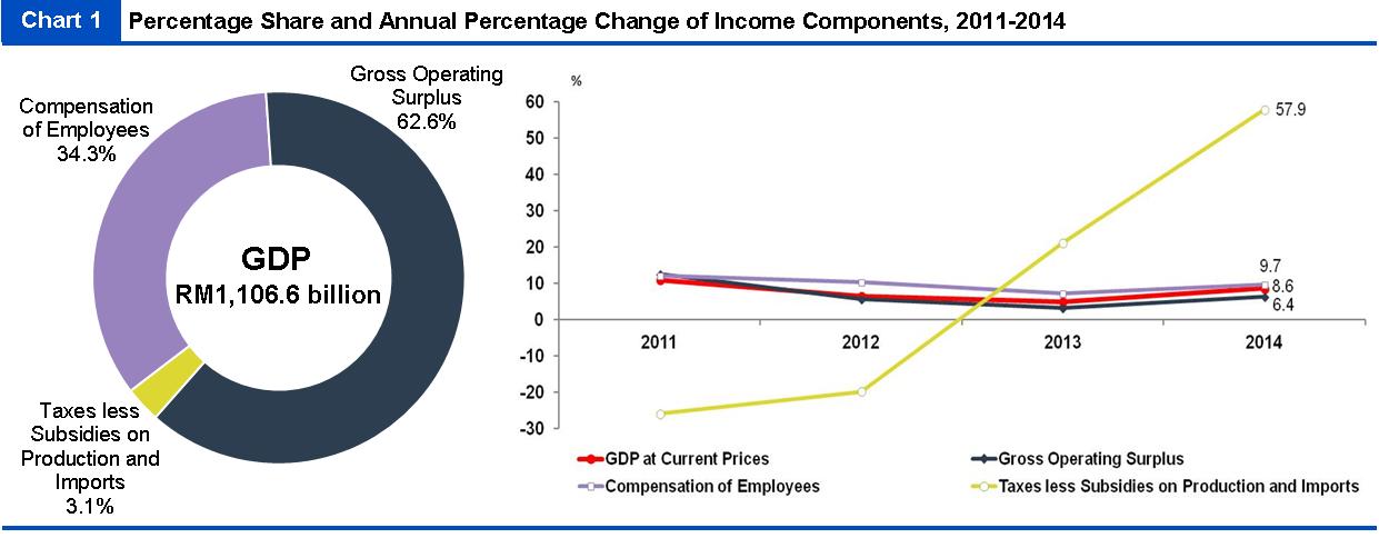 Malaysia’s economy recorded a value of GDP at RM1,106.6 billion in 2014 (2013: RM1,018.8 billion) at current prices (Chart 1). The contribution of Compensation of Employees to Malaysia’s economy accounted for 34.3 per cent (RM379.4 billion) while Gross Operating Surplus holds the largest share in income components at 62.6 per cent (RM692.9 billion). The remaining of 3.1 per cent (RM34.3 billion) was contributed by Taxes less Subsidies on Production and Imports.