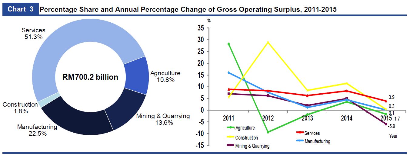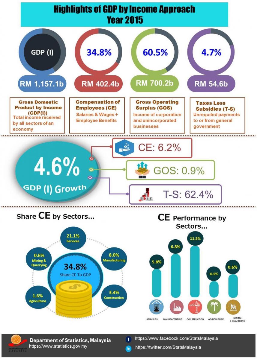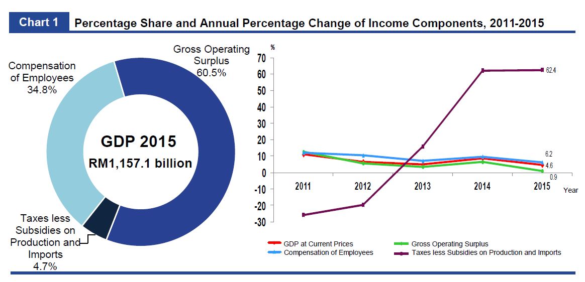 The overall economy recorded a growth of 4.6 per cent in 2015 supported by the positive performance in Services, Manufacturing and Construction sectors. Compensation of Employees grew 6.2 per cent as compared to 9.7 per cent in the previous year, while Gross Operating Surplus slower to 0.9 per cent (2014: 6.4%). Conversely, Taxes less Subsidies on Production and Imports escalated to 62.4 per cent contributed by the rationalisation of subsidy and implementation of Goods and Services Tax (GST) by the government in 2015.