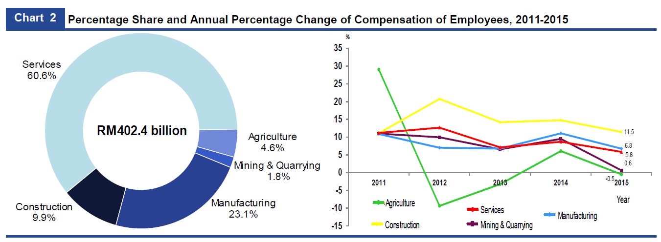As the prime mover of the economy, Services sector contributed the largest share to the total CE at 60.6 per cent while share of Manufacturing sector accounted for 23.1 per cent in 2015 (Chart 2). Following the labour intensive characteristic in Construction, this sector was the third largest contributor which expanded to 9.9 per cent from 9.4 per cent in the last year. Moreover, Agriculture and Mining & Quarrying hold 4.6 per cent and 1.8 per cent of share respectively.