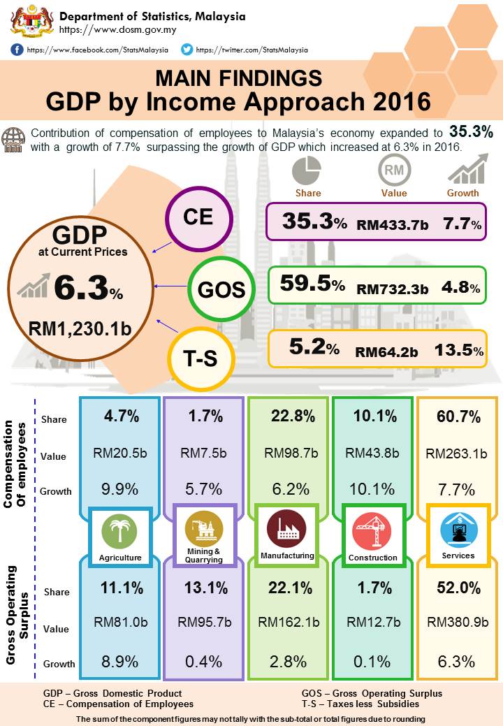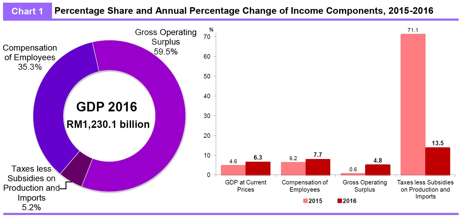 Malaysia’s economy increased in 2016 as the value of GDP at current prices expanded further to register RM1,230.1 billion and grew 6.3 per cent as depicted in Chart 1. The expansion in GDP was propelled by the higher performance of all income components spearheaded by Gross Operating Surplus (GOS) which recorded RM732.3 billion while Compensation of Employees (CE) has reached a value of RM433.7 billion. Taxes less Subsidies on Production and Imports stood at RM64.2 billion.