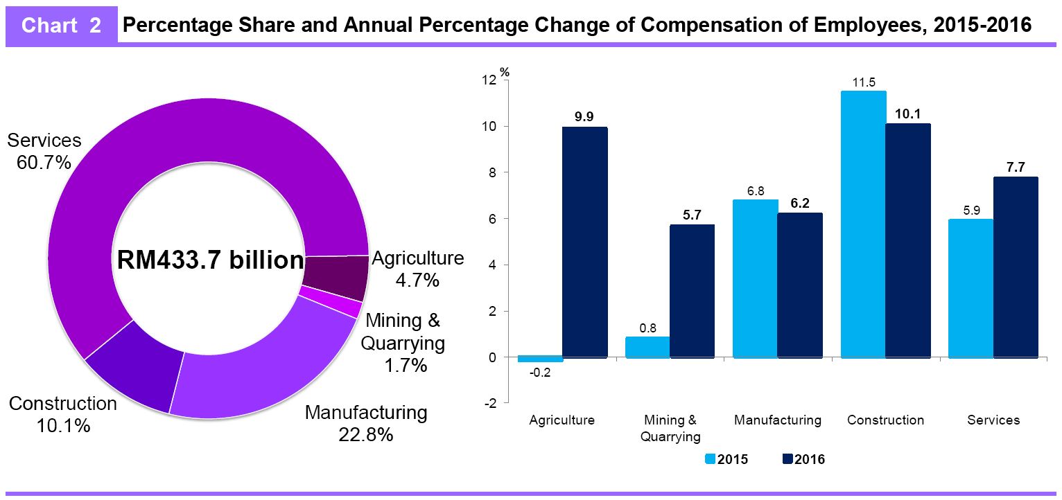 Services was the largest contributor to the total CE with a share of 60.7 per cent followed by Manufacturing which accounted for 22.8 per cent in 2016 as illustrated in Chart 2. Construction expanded to 10.1 per cent as compared to 9.9 per cent in the previous year. Moreover, Agriculture and Mining & Quarrying recorded a share of 4.7 per cent and 1.7 per cent respectively.