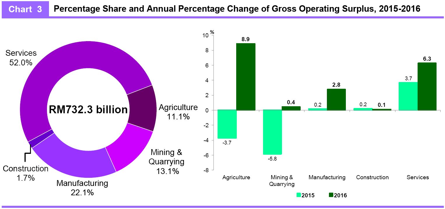 As the largest contributor to the economy, Services accounted for 52.0 per cent to total GOS in 2016 followed by Manufacturing at 22.1 per cent as shown in Chart 3. Mining & Quarrying and Agriculture contributed 13.1 per cent and 11.1 per cent respectively. Meanwhile, Construction recorded a contribution of 1.7 per cent.