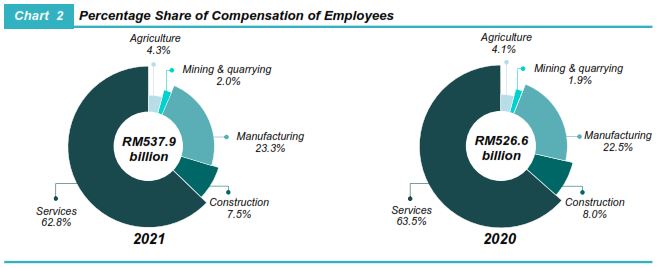 The Services sector remained as the largest contributor to the total of Malaysia’s CE, generating 62.8 per cent, which was slightly lower than 63.5 per cent recorded in 2020. Meanwhile, the share of Manufacturing sector increased to 23.3 per cent, as compared to 22.5 per cent in the previous year. The Construction sector accounted for 7.5 per cent (2020: 8.0%), followed by Agriculture and Mining & quarrying sectors, which formed 4.3 per cent (2020: 4.1%) and 2.0 per cent (2020: 1.9%), respectively as shown in Chart 2.