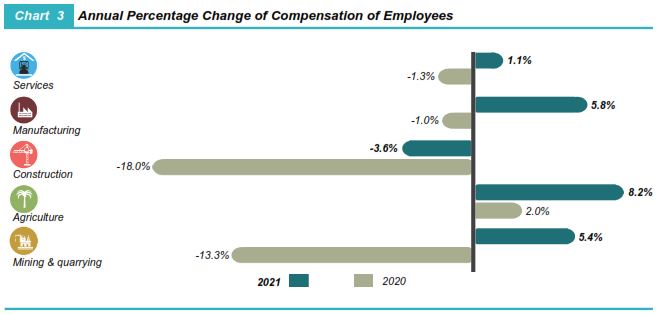 CE for Agriculture sector expanded to 8.2 per cent as compared to 2.0 per cent in the preceding year, mainly driven by oil palm activities. Mining & quarrying sector elevated to 5.4 per cent compared to a significant negative 13.3 per cent in the previous year. Conversely, CE for Construction sector registered a smaller contraction of 3.6 per cent as compared to a decline of 18.0 per cent in the preceding year (Chart 3).