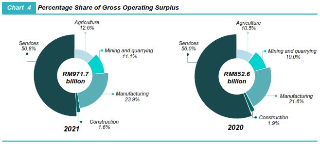As the largest contributor to the economy, Services sector accounted for 50.8 per cent (2020: 56.0%) to the total GOS in 2021. This was followed by Manufacturing sector with the share of 23.9 per cent (2020: 21.6%). Agriculture and Mining & quarrying sectors contributed 12.6 per cent and 11.1 per cent, respectively. Meanwhile, Construction sector recorded the lowest contribution amounted 1.6 per cent (2020: 1.9%) of the overall GOS as illustrated in Chart 4.