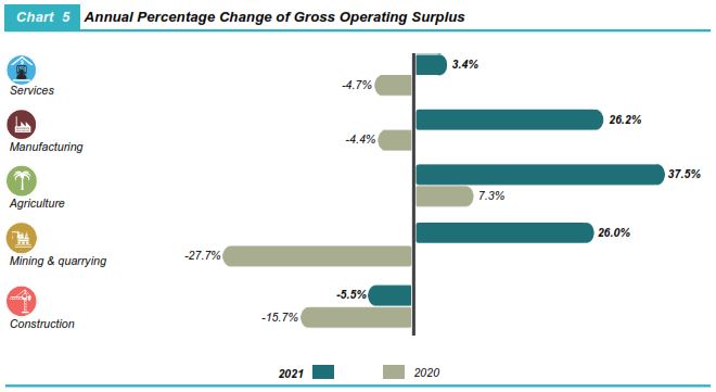 GOS formed a substantial share to GDP and the growth of this component was in line with the economic performance. Thus, GOS surged to 14.0 per cent surpassing the economic growth of 9.0 per cent, supported by the expansion in all sectors. In 2021, the Manufacturing, Agriculture and Mining & quarrying sectors recorded a double-digit growth of GOS.
