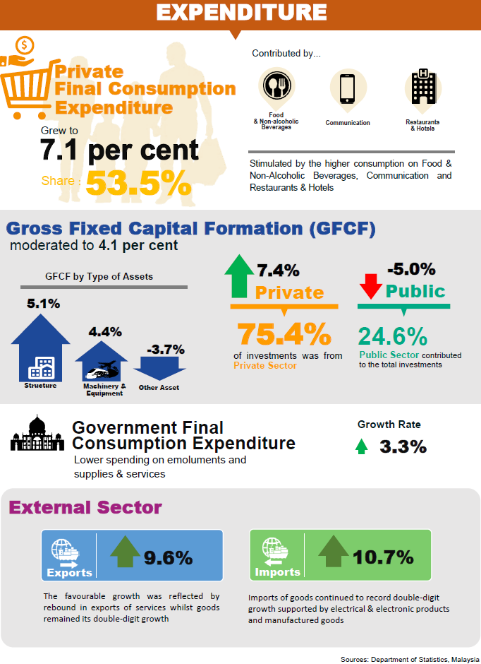Services sector recorded a sturdy growth of 6.3 per cent after registering 5.8 per cent in previous quarter. The higher momentum for this quarter was impelled by Wholesale & Retail Trade which advanced to 7.7 per cent. Information & Communication remained robust which increased to 8.5 per cent spurred by data communication, computer services and information services activities. Meanwhile, Finance & Insurance and Business Services stepped up to 5.1 per cent and 8.5 per cent respectively have intensified the growth of Services sector.