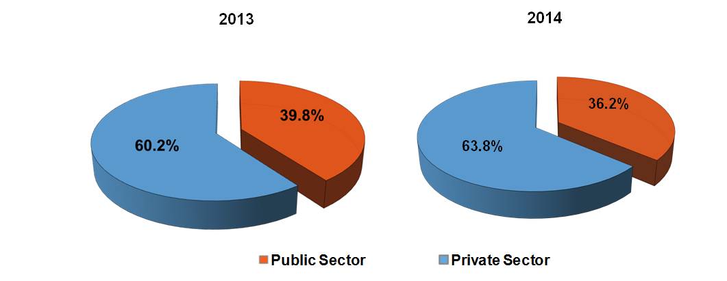 The performance of Malaysia's investment was reinforced by the Private sector with a share of 63.8 per cent (2013: 60.2%). Meanwhile, the investment in Public sector contributed 36.2 per cent in 2014 (Chart 3).