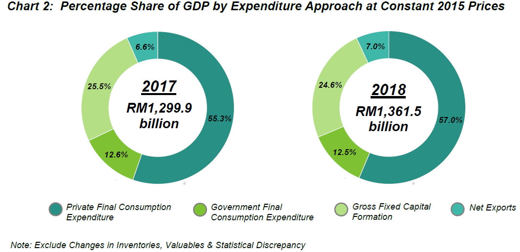 As the second largest component in GDP, GFCF contributed a share of 24.6 per cent (2017: 25.5%) from the overall economy as shown in Chart 2. For year 2018, GFCF was propelled by the investments from Private sector.