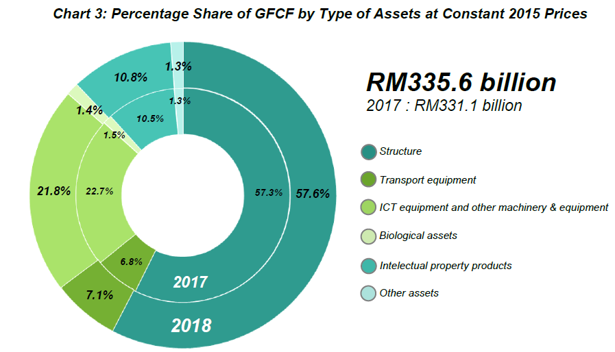 Structure remained as the catalyst in GFCF by type of assets representing 57.6 per cent of total GFCF with a growth of 1.9 per cent (2017: 4.1%) as shown in Chart 3. The acquisition of fixed assets in ICT equipment and other machinery & equipment declined 2.7 per cent (2017: 15.6%) due to lower expenditure on ICT equipment & software. However, Transport equipment improved to 6.0 per cent (2017: 3.3%).