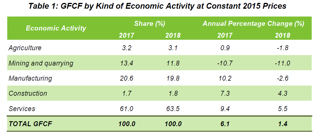 For year 2018, GFCF for Services and Construction recorded a slower performance while the other remaining activities recorded a negative growth, as shown in Table 1.