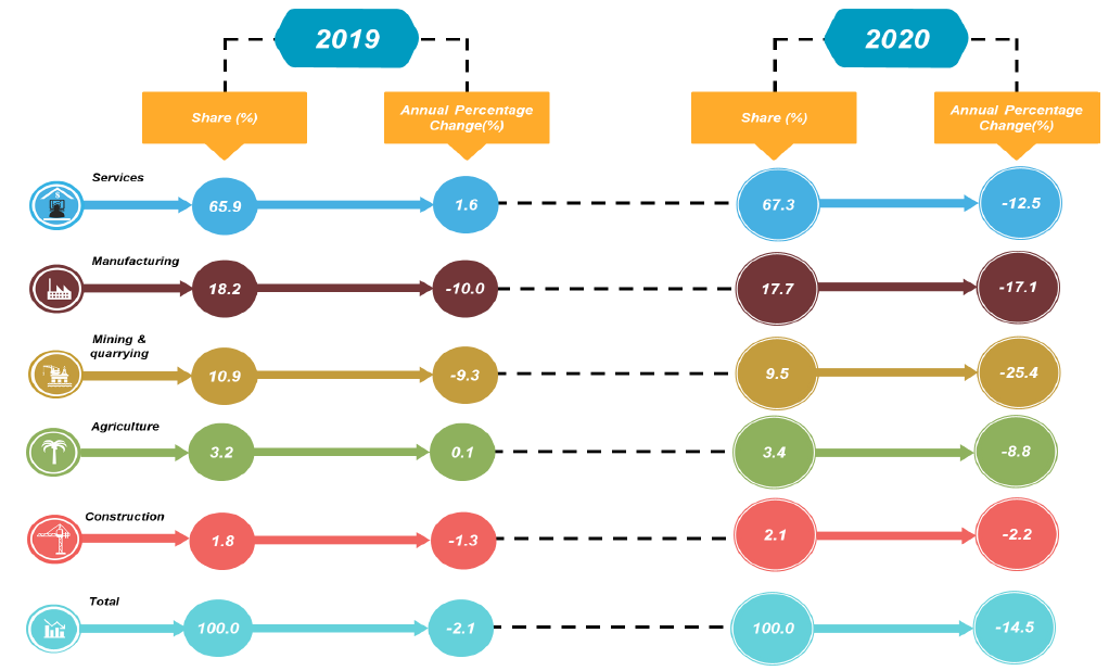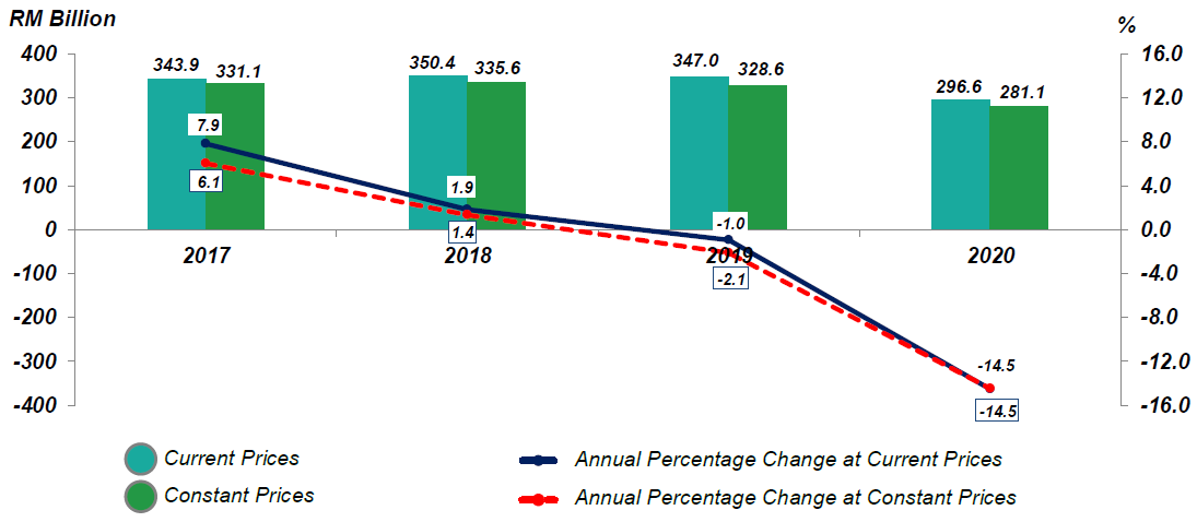Mining and quarrying sector declined by 25.4 per cent from a decrease of 9.3 per cent in the preceding year. Agriculture sector also contracted 8.8 per cent (2019: 0.1%) attributed to the weakened performance in all sub-sectors. Meanwhile Construction sector decreased by 2.2 per cent in 2020, steeper than the decline of 1.3 per cent recorded in the previous year.