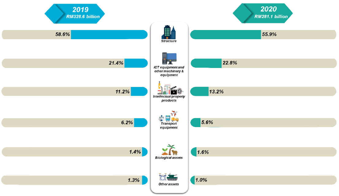Structure remained as the major contributor to GFCF with a share of 55.9 per cent, although it declined 18.3 per cent (2019: -0.5%) in 2020 compared with a year a go. Furthermore, ICT equipment and other machinery & equipment dropped to 8.9 per cent (2019: -4.1%), while Intellectual property products grew marginally at 0.6 per cent (2019: 2.2%).