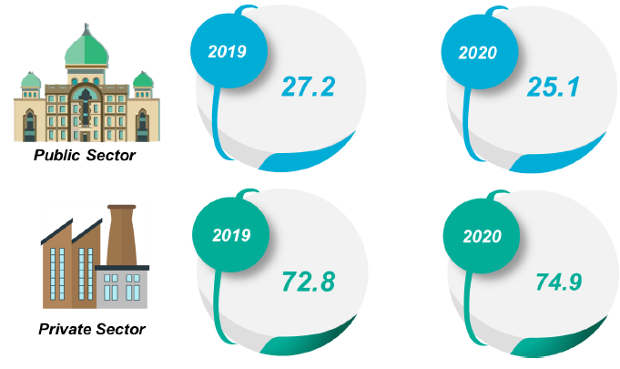 Private sector continued to be the dominant contributor to GFCF (share: 74.9%) declined 11.9 per cent as compared to 1.6 per cent in 2019. Public sector (share: 25.1%) also showed a similar downward trend by recording a further decrease of 21.3 per cent in 2020 as illustrated in Exhibit 3.