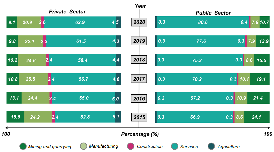 GFCF of Public sector was largely dominated by Services activity with a highest share of 80.6 per cent. This was followed by Mining & quarrying and Manufacturing activities at 10.7 per cent and 7.9 per cent share respectively.