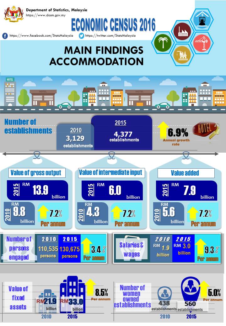 This publication presents statistics on accommodation services obtained from the Economic Census 2016 for reference year 2015. Accommodation services which encompasses hotels (including resort hotels), apartment hotels, budget hotels, chalets and rest house, guest house, hostel, bed & breakfast and camping grounds.