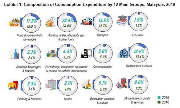 In 2019, the mean monthly household consumption expenditure rose 3.9 per cent per annum in tandem with the moderate growth of mean monthly household income at 4.2 per cent for the period 2016 to 2019. In terms of value, the mean monthly household expenditure increased from RM4,033 in 2016 to RM4,534 in 2019. Meanwhile, the median monthly household expenditure registered RM3,654 in 2019 compared to RM3,314 in 2016.