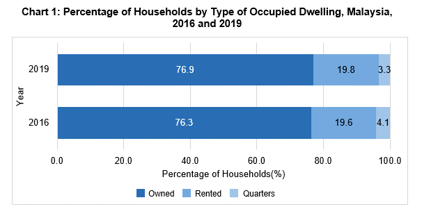 Based on the survey, the percentage of occupied dwelling owned by households has increased by 0.6 percentage points from 76.3 per cent in 2016 to 76.9 per cent. At the same time the percentage of rented dwellings also increased by 0.2 percentage points to 19.8 per cent. However, the percentage of households living in quarters dropped by 0.8 percentage points to 3.3 per cent.