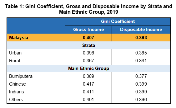 The 2019 findings depicted the value of Gini coefficient that was calculated based on gross income increased by 0.008 percentage points from 0.399 (2016) to 0.407 (2019). Over the period, Gini coefficient in urban area increased from 0.389 to 0.398 whereas Gini coefficient in rural rose from 0.364 to 0.367. The Gini coefficient for the Bumiputera has risen from 0.385 to 0.389 while for the Chinese it has increased from 0.411 to 0.417. The Gini coefficient for the Indians also increased from 0.382 to 0.411.