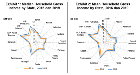 At state level, W.P. Kuala Lumpur recorded the highest median income with RM10,549 followed by W.P. Putrajaya (RM9,983), Selangor (RM8,210), W.P. Labuan (RM6,726), Johor (RM6,427), Pulau Pinang (RM6,169) and Melaka (RM6,054). W.P. Putrajaya had the highest compounded annual growth rate of median income at 6.3 per cent over the period of 2016 to 2019, 1.6 times higher than the national median growth rate, 3.9 per cent. Eight other states that also exceeded the national median growth rate were Terengganu (5.6%), W.P. Kuala Lumpur (5.0%), Kelantan (4.9%), Pulau Pinang (4.4%), Johor (4.3%), Selangor (4.3%), W.P. Labuan (4.2%) and Kedah (4.2%).