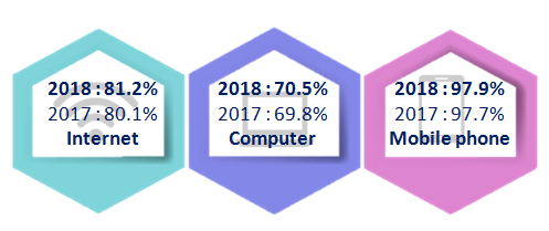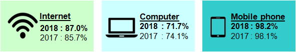 Percentage of households access to Internet increased 1.3 percentage points to 87.0 per cent in 2018 compared to 85.7 per cent in 2017. Households access to computer decreased 2.4 percentage points from 74.1 per cent in 2017 to 71.7 per cent in 2018. Percentage of households access to mobile phone also increased 0.1 percentage points to 98.2 per cent in 2018 as compared to 98.1 per cent in 2017.