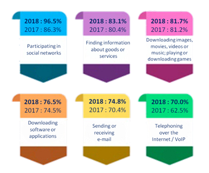 The most popular Internet activities by the Internet user were participating in social networks (96.5%), finding information about goods or services (83.1%), downloading images, movies, videos or music; playing or downloading games (81.7%), downloading software or applications (76.5%) and sending or receiving e-mails (74.8%).