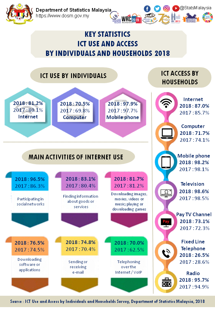 In 2018, percentage of individuals in Malaysia aged 15 years and above using Internet was 81.2 per cent, increased by 1.1 percentage points compared to 80.1 per cent in 2017. Percentage of individuals using computer also increased 0.7 percentage points from 69.8 per cent in 2017 to 70.5 per cent in 2018. Meanwhile, 97.9 per cent of individuals were using mobile phones in 2018 compared to 97.7 per cent in 2017.