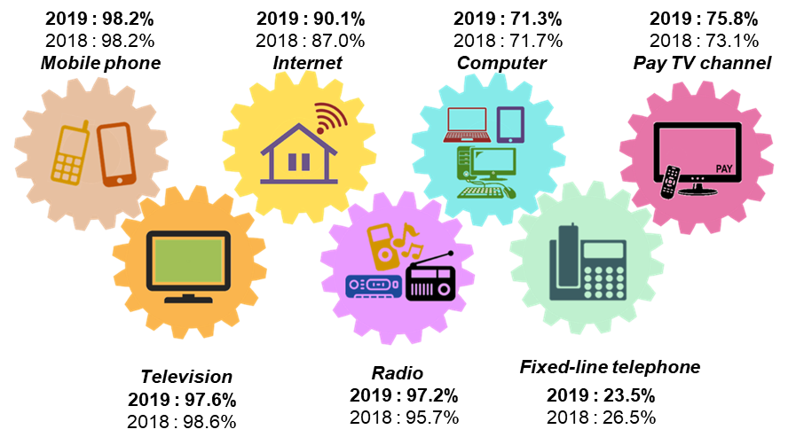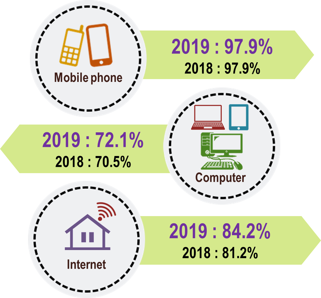 The percentage of households access to Internet, pay TV channel, radio showed an increase to 90.1 per cent (3.1 percentage points), 75.8 per cent (2.7 percentage points) and 97.2 per cent (1.5 percentage points) respectively. In contrast, the percentage of access to fixed-line telephone, television and computer showed a decrease to 23.5 per cent (-3.0 percentage points), 97.6 per cent (-1.0 percentage points) and 71.3 per cent (-0.4 percentage points) respectively. Meanwhile the percentage of households access to mobile phone remained at 98.2 per cent in 2019.