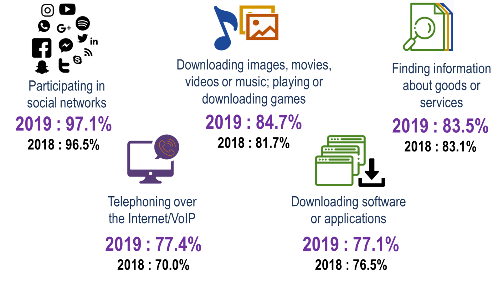 The main Internet activities by individuals were participating in social networks (97.1%) continues to be the most popular activity among Internet users. This was followed by activities of downloading images, movies, videos or music; playing or downloading games (84.7%), finding information about goods or services (83.5%), telephoning over the Internet/ VoIP (77.4%) and downloading software or applications (77.1%).