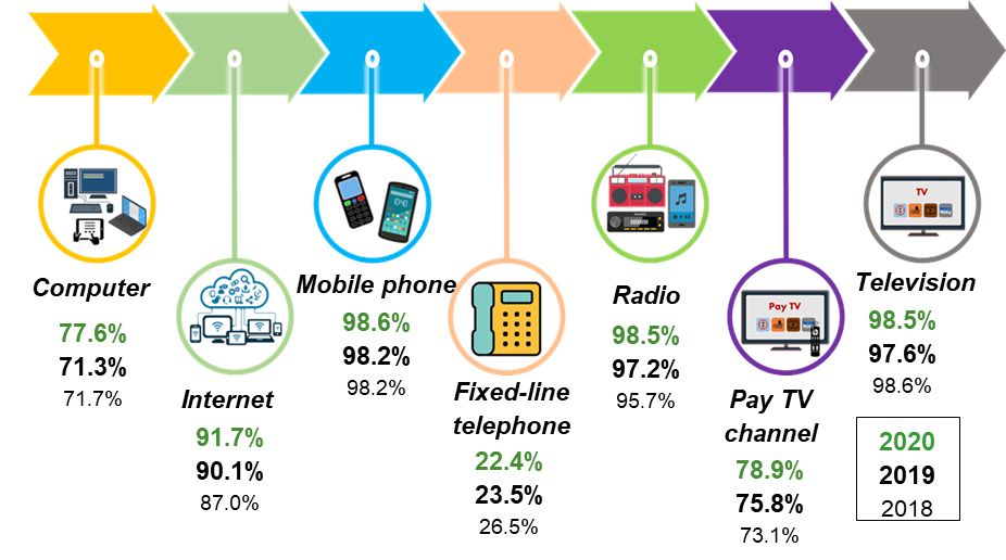 The percentage of household access showed an increase in access to mobile phones (98.6%), television (98.5%), radio (98.5%), internet (91.7%), pay TV channel (78.9%) and computer (77.6%). Meanwhile the percentage of household access to fixed-line telephones decreased to 22.4 per cent.