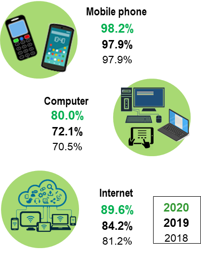The percentage of individuals using the internet increased by 5.4 percentage points from 84.2 per cent in 2019 to 89.6 per cent in 2020. The percentage of individuals using computers increased by 7.9 percentage points from 72.1 per cent in 2019 to 80.0 per cent in 2020. Meanwhile, the percentage of individuals using mobile phone increased by 0.3 percentage points from 97.9 per cent in 2019 to 98.2 per cent in 2020.