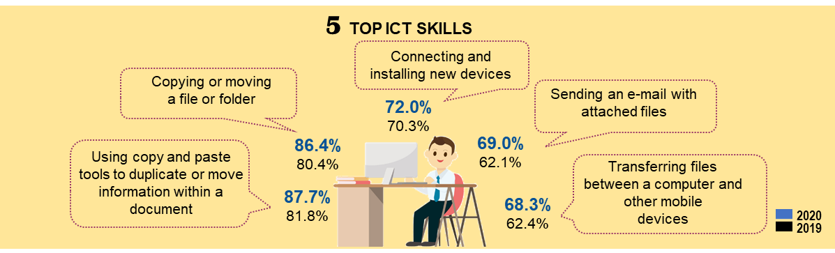 The ICT skill that showed highest percentage in 2020 was using copy and paste tools to duplicate or move information within a document (87.7%). This is followed by copying or moving a file or folder (86.4%), connecting and installing new devices (72.0%), sending an e-mail with attached files (69.0%) and transferring files between a computer and other mobile devices (68.3%).