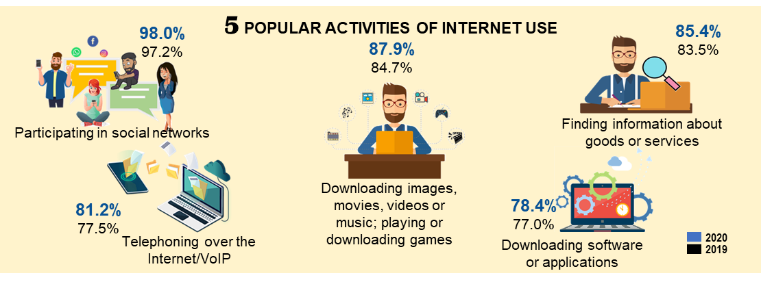 The most popular internet user activities in 2020 was participating in social networks (98.0%). This is followed by downloading images, movies, videos, or music; playing or downloading games (87.9%), finding information about goods and services (85.4%), make a phone call over the internet/ VoIP (81.2%) and downloading software or applications (78.4%).