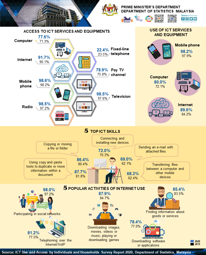 The full publication of the ICT Use and Access by Individuals and Households Survey Report (ICTHS) 2020 can be downloaded through eStatistik portal.