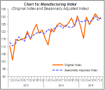 PERFORMANCE OF MANUFACTURING SECTOR Year-on-year, Manufacturing sector output grew by 4.3% in August 2015 after an increase of 4.2% in July 2015. The major sub-sectors which recorded an expansion in August 2015 were: Electrical and Electronics Products (11.7%); Food, Beverages and Tobacco (4.7%) and Non-metallic Mineral Products, Basic Metal and Fabricated Metal Products (3.7%). On a seasonally adjusted month-on-month basis, Manufacturing output grew by 1.9% in August 2015. |