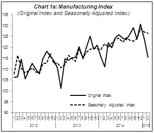 PERFORMANCE OF MANUFACTURING SECTOR Year-on-year, Manufacturing output increased by 4.0% in February 2015 after a strong growth of 6.6% in January 2015. The sub-sectors which shown an increase in February 2015 were: Electrical and Electronics Products (8.4%); Petroleum, Chemical, Rubber and Plastic Products (4.1%); and Transport Equipment and Other Manufactures Products (8.7%). On a seasonally adjusted month-on-month basis, Manufacturing output declined by 0.3% in February 2015.