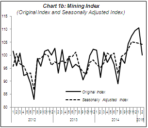PERFORMANCE OF MINING SECTOR The Mining sector output registered a positive growth of 9.2% in February 2015 compared to the same month in 2014. This strong growth was contributed by the increase of Crude Oil index by 19.7%. The Natural Gas index, however, declined by 1.6%. As against January 2015, seasonally adjusted output for the Mining sector decreased by 0.3%. |