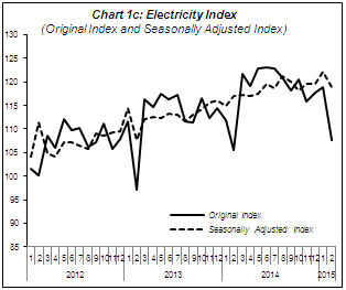 In seasonally adjusted terms, the IPI in February 2015 decreased by 0.1% month-on-month following a decline in the indices: Manufacturing (0.3%), Mining (0.3%) and Electricity (2.6%). |