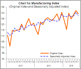PERFORMANCE OF MANUFACTURING SECTOR Year-on-year, Manufacturing sector output grew moderately at 4.2% in July 2015 after an increase of 4.9% registered in June 2015. The major sub-sectors which increased in July 2015 were: Electrical and Electronics Products (7.2%); Petroleum, Chemical, Rubber and Plastic Products (3.3%) and Transport Equipment and Other Manufactures (8.8%). On a seasonally adjusted month-on-month basis, Manufacturing output declined by 2.4% in July 2015. |