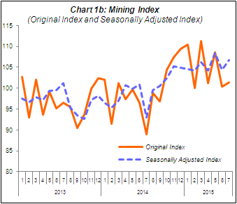 PERFORMANCE OF MINING SECTOR The Mining sector output recorded substantial growth of 14.0% in July 2015 as compared to the same month in 2014. This expansion was contributed by the increase of Crude Oil index (7.5%) and Natural Gas index (22.3%). As against June 2015, seasonally adjusted output for the Mining sector edged up by 2.3%. |