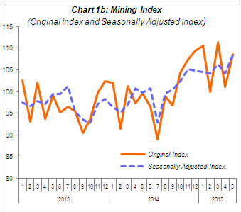 PERFORMANCE OF MINING SECTOR The Mining sector output recorded a strong growth of 9.0% in May 2015 compared to the same month in 2014. This expansion was mainly driven by the increase of Crude Oil index at 18.8%. The Natural Gas index, however, declined by 1.9%. As against April 2015, seasonally adjusted output for the Mining sector increased by 4.0%. |