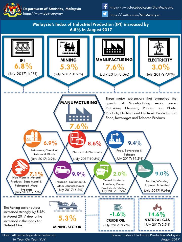 Malaysia’s Index of Industrial Production (IPI) increased by 6.8 percent in August 2017