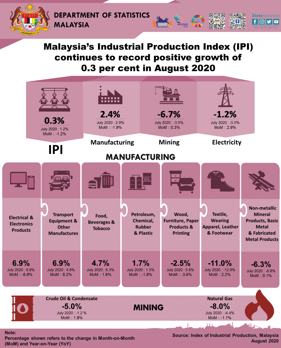 Malaysia’s Industrial Production Index (IPI) continues to record positive growth of 0.3 per cent in August 2020