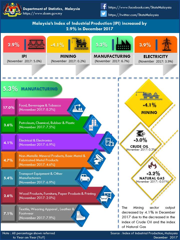 Malaysia’s Index of Industrial Production (IPI) increased by 2.9 per cent in December 2017