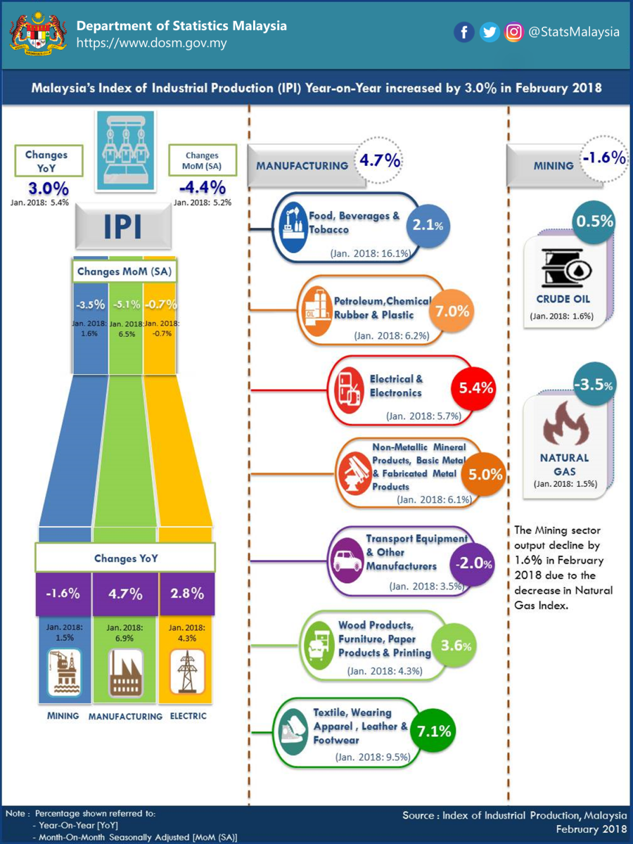 The Industrial Production Index (IPI) expanded by 3.0 per cent in February 2018 as compared with the same month of the previous year. The expansion in February 2018 was supported by the positive growth in the Manufacturing index (4.7%) and the Electricity index (2.8%). Meanwhile, the Mining index recorded a decline of 1.6 per cent. IPI in January 2018 was revised to 5.4 per-cent year-on-year.