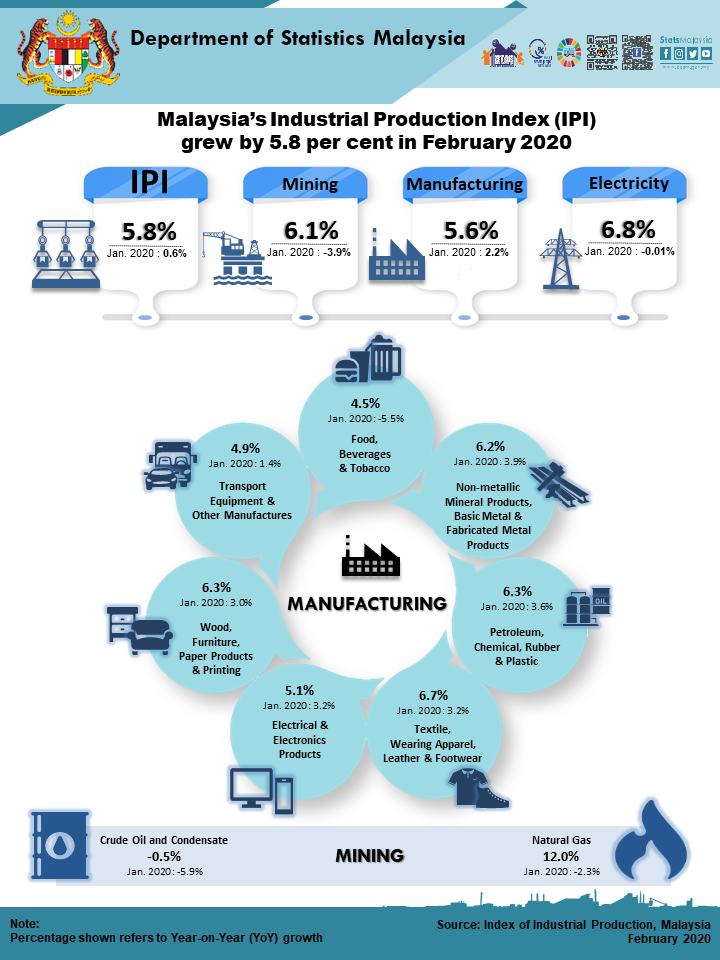 Malaysia’s Industrial Production Index (IPI) grew by 5.8 per cent in February 2020