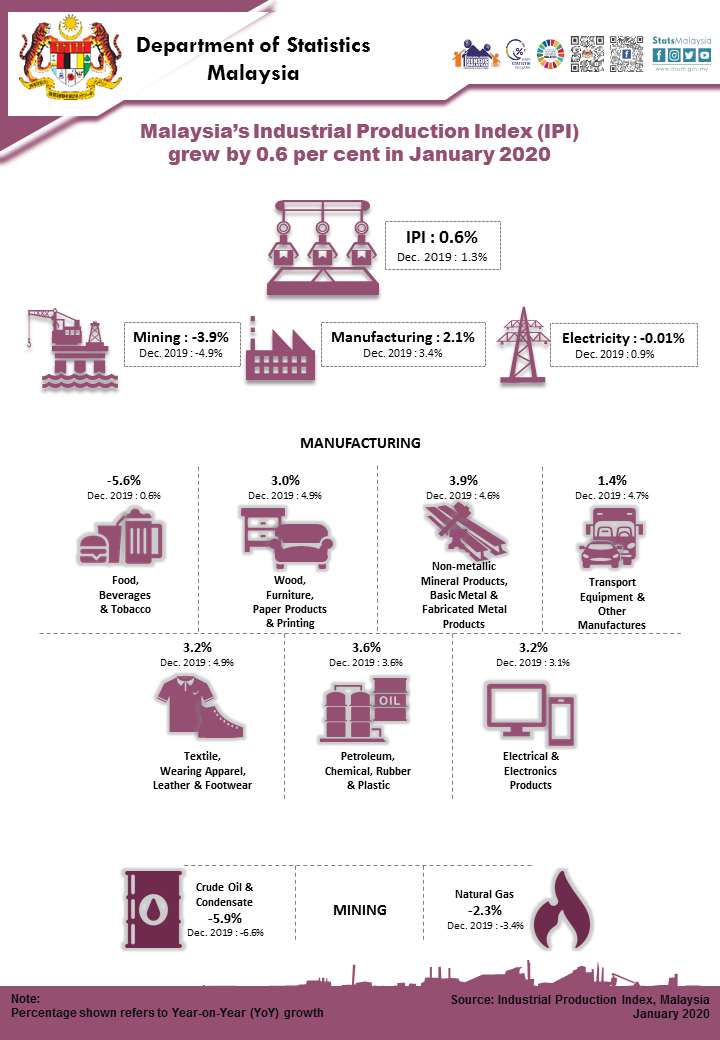 Malaysia’s Industrial Production Index (IPI) grew by 0.6 per cent in January 2020