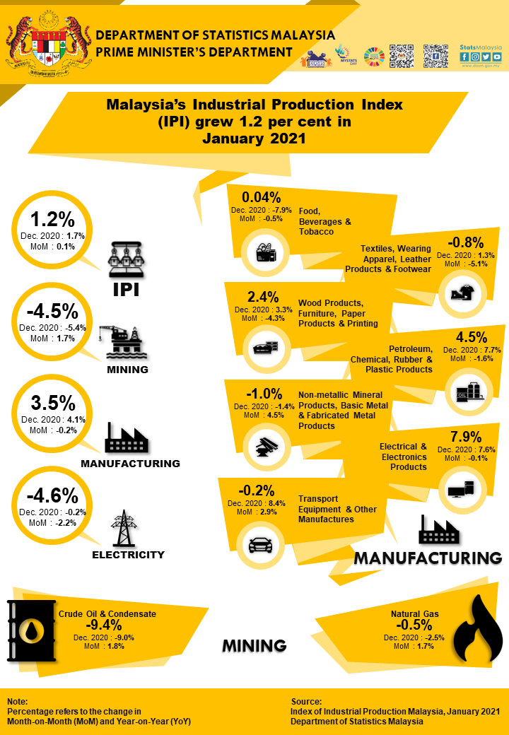 Malaysia’s Industrial Production Index (IPI) grew 1.2 per cent in January 2021