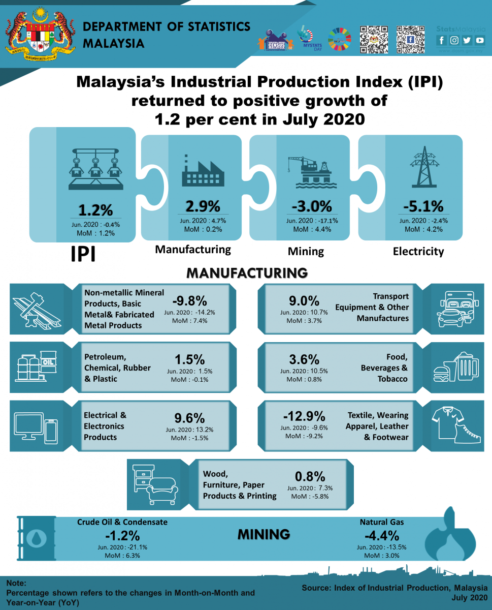 Malaysia’s Industrial Production Index (IPI) returned to positive growth of 1.2 per cent in July 2020